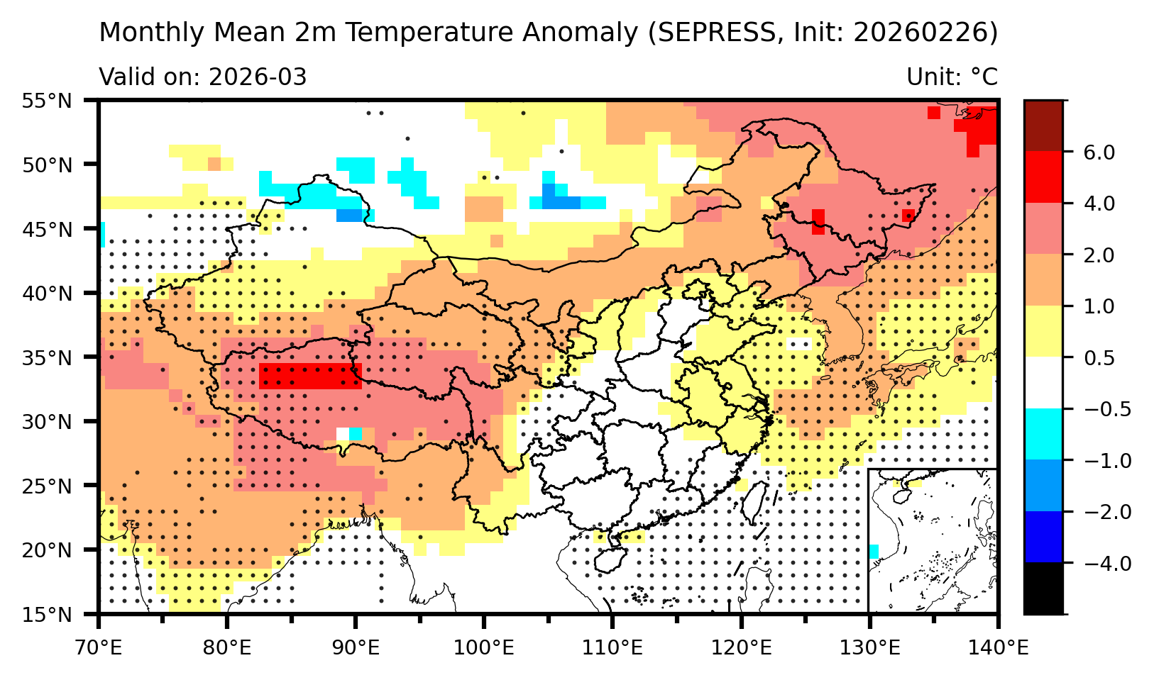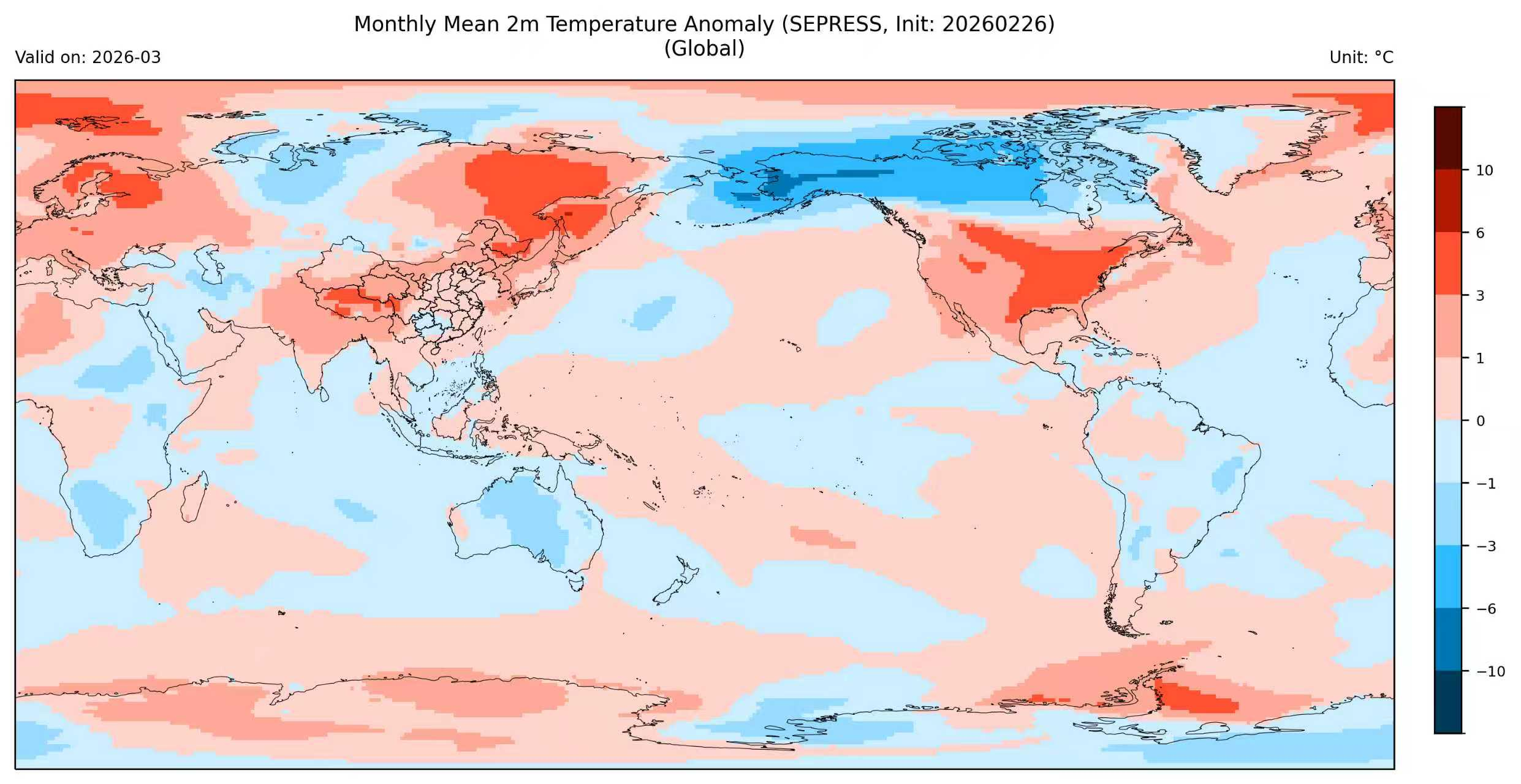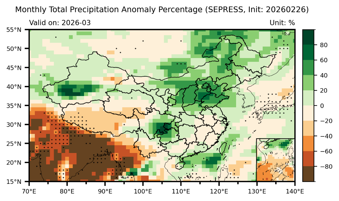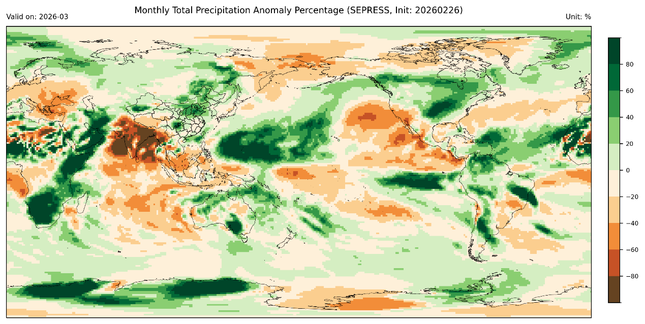 In March 2026, surface temperatures in China are generally above average, with the most significant temperature anomalies observed in the Northeast and Western regions. Temperatures in the three northeastern provinces, Inner Mongolia, Gansu, Tibet, southern Xinjiang, and western Sichuan and Yunnan are generally above 1°C, with areas in Tibet, Heilongjiang, and Jilin experiencing temperature increases of over 2°C, and some regions potentially exceeding 4°C. In contrast, temperatures in North China and the Huang-Huai region are close to normal or slightly warmer, while central and southern China maintain near-normal levels. Precipitation in China shows a “wet north, dry south, and significantly dry in the Qinghai-Tibet Plateau” distribution. Northern and central China receive 20-60% more rainfall than usual, with particularly notable increases in precipitation in central and eastern Inner Mongolia, northern Beijing-Tianjin-Hebei, southern Xinjiang, and the Sichuan Basin, where rainfall could increase by over 60%, and some areas may experience frequent strong precipitation events. In the Huang-Huai to the middle and lower Yangtze River regions, precipitation is slightly below average. In addition, most of the Qinghai-Tibet Plateau and southern Yunnan experience a 20-40% decrease in rainfall, with some areas receiving less than half of the usual precipitation, creating a high risk of meteorological drought. Close attention is recommended to agricultural production and water resource management. Overall, the north should be on guard for secondary disasters caused by snowmelt and strong precipitation events, while the southwest and parts of South China should focus on drought prevention and spring irrigation water security.