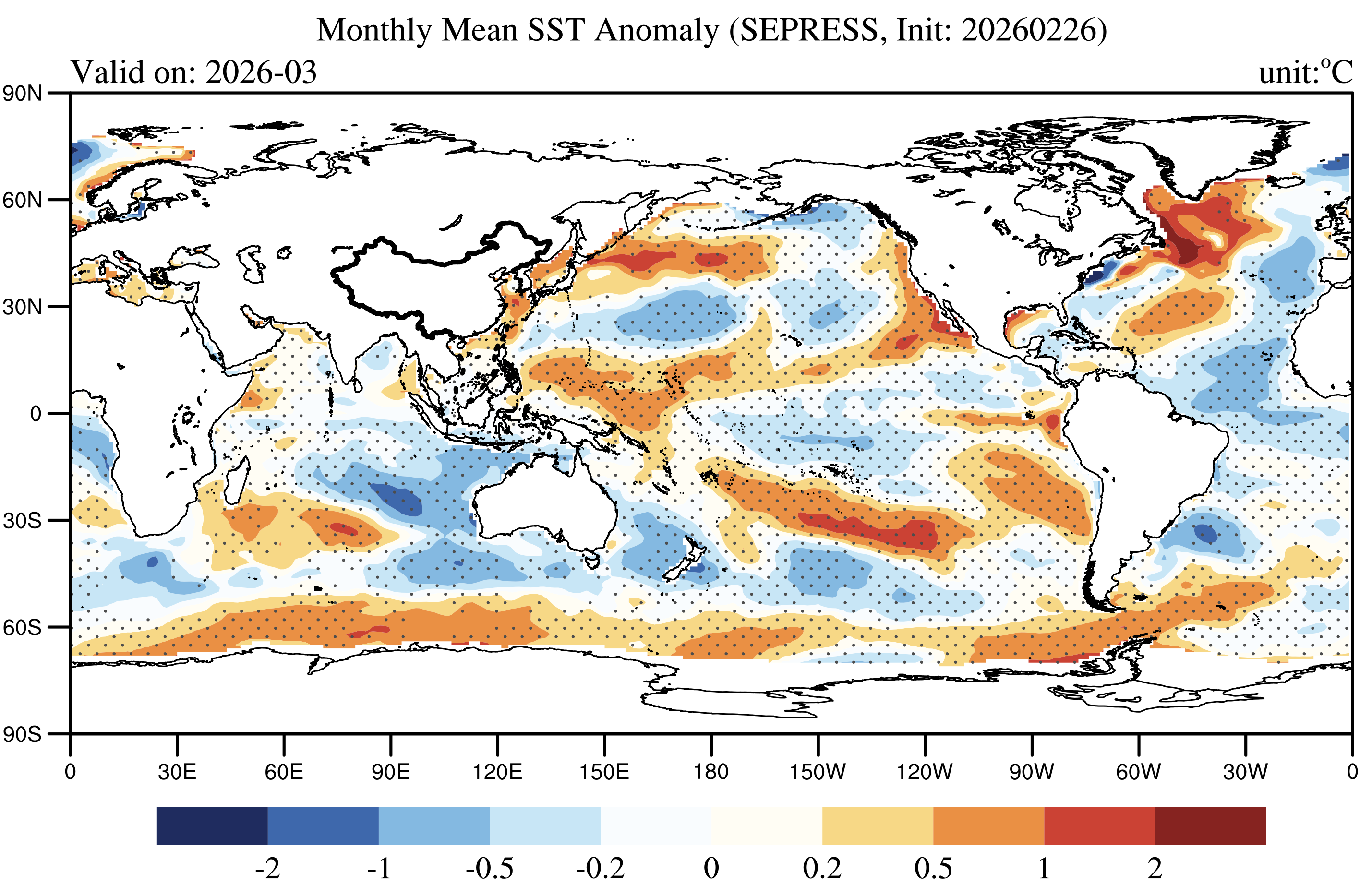 On a global scale, sea surface temperatures, near-surface air temperatures, and precipitation show that the “La Niña” phenomenon continues to weaken and undergo a phase transition. The equatorial eastern Pacific is expected to warm by about 0.5°C, while the central Pacific will maintain a negative anomaly of 0.2-0.5°C. The equatorial Walker circulation still shows a significant lag effect, leading to warmer sea temperatures and active convection in the northwest Pacific’s mid-latitudes, with precipitation exceeding 80% above average, while the northeast Pacific experiences 20-40% below-average precipitation. In the southern hemisphere, the subtropical Indian Ocean exhibits a positive dipole (SIOD+), affecting cross-equatorial flow and resulting in significantly wetter conditions in the western Indian Ocean, South Africa, East Africa, and the Arabian Peninsula, with precipitation over 80% above average. In contrast, the Indian subcontinent and the eastern Arabian Sea show extreme dryness with precipitation reductions exceeding 80%. Meanwhile, the northern hemisphere exhibits strong regional temperature contrasts, with the Eurasian continent showing a distinct meridional “warm-cold-warm” tripole structure and North America experiencing sharp latitudinal temperature differences, with Alaska and northern North America experiencing temperatures 2-4°C below normal, while most of the mid-latitudes are 2-4°C warmer. These temperature differences may indicate the continued active state of the northern hemisphere’s early spring polar vortex and blocking high-pressure systems. It is important to closely monitor how the global anomalous circulation patterns will affect future climate trends, particularly the onset of China’s rainy season.