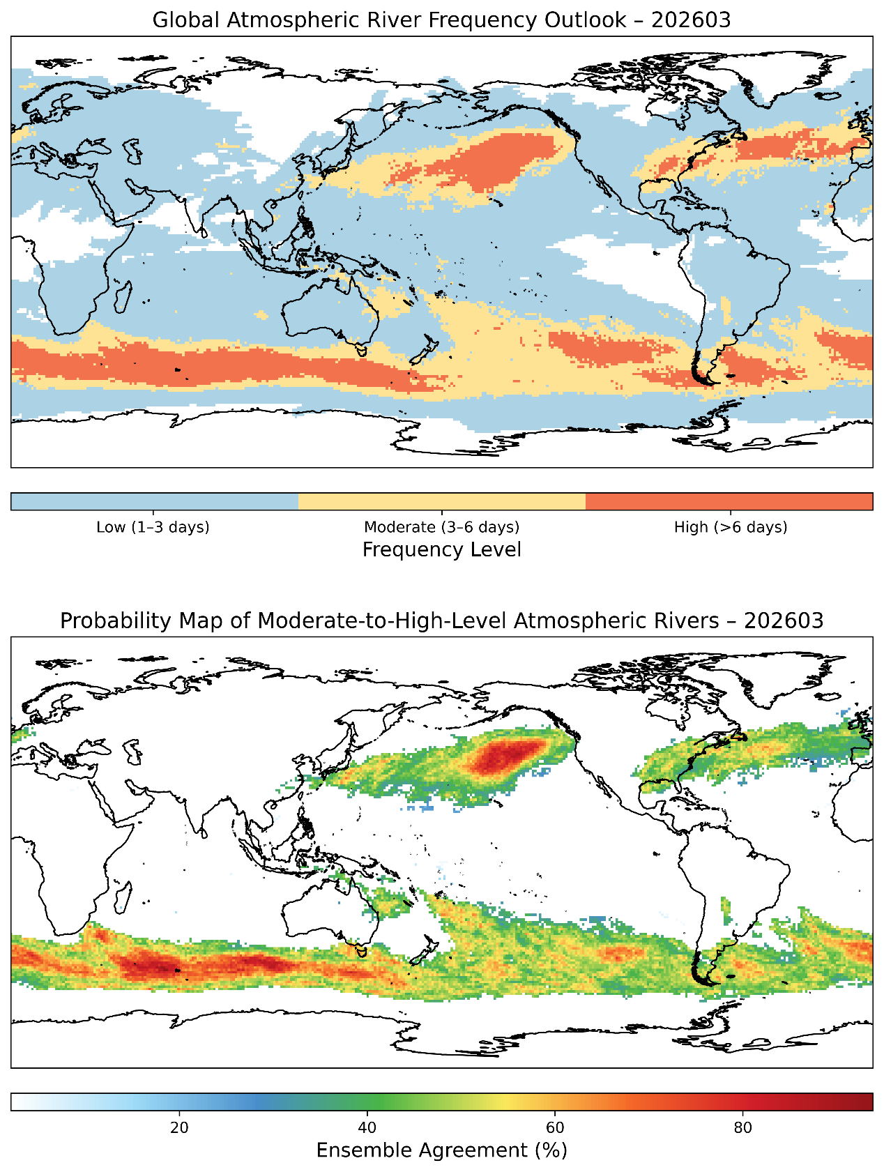Using the PanLu2.0 Atmospheric River Identification and Tracking Algorithm developed by our team, March 2026 atmospheric river (AR) activity has been globally identified. Based on global distribution predictions, the west coast of Canada and the east coast of the United States have a high probability of experiencing high-level atmospheric rivers in March, with strong consistency across model ensemble. Considering the global precipitation anomaly map and atmospheric river frequency map, special attention should be given to the potential disasters caused by persistent heavy rainfall (or snowfall) from storms in Canada and the eastern United States, as well as their impact on transportation.
